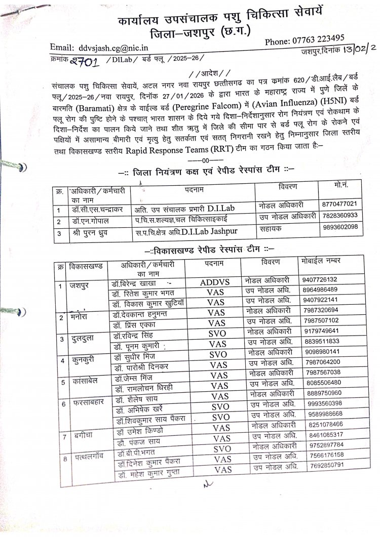 जशपुरनगर | 07 अप्रैल 2026 जशपुर जिले में बर्ड फ्लू (एविएन एनफ्लुएंजा) की रोकथाम और किसी भी संभावित खतरे से निपटने के लिए जिला प्रशासन पूरी तरह मुस्तैद हो गया है। कलेक्टर श्री रोहित व्यास के मार्गदर्शन में जिले में त्वरित कार्रवाई सुनिश्चित करने हेतु 01 जिला स्तरीय और 08 विकासखण्ड स्तरीय 'रैपिड रिस्पॉन्स टीम' (RRT) का गठन किया गया है।