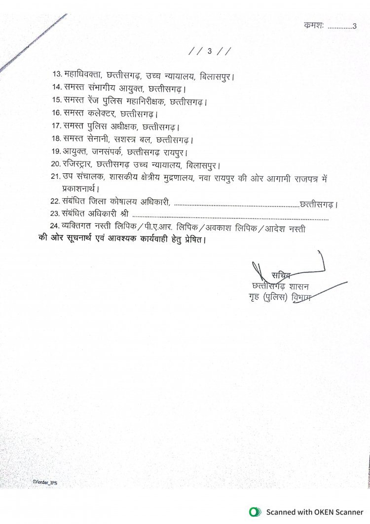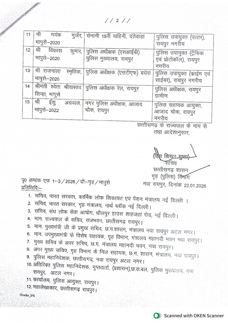 यह आदेश राज्यपाल के नाम से सचिव (गृह) हिमशिखर गुप्ता द्वारा जारी किया गया है। रायपुर में पुलिस कमिश्नर प्रणाली लागू होने के बाद यह पहली बड़ी सूची है, जिससे राजधानी की सुरक्षा और कानून व्यवस्था में बड़े बदलाव की उम्मीद है।
