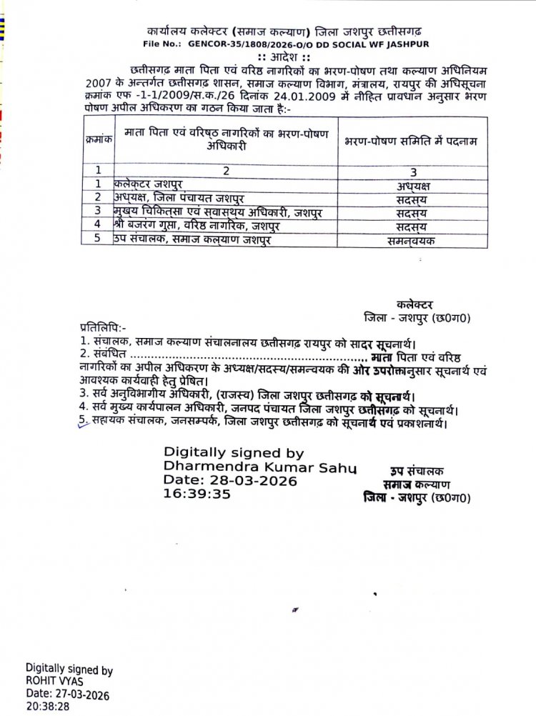 जशपुरनगर | 30 मार्च 2026 छत्तीसगढ़ शासन के समाज कल्याण विभाग की पहल पर जशपुर जिले में बुजुर्गों और माता-पिता के अधिकारों की रक्षा के लिए एक महत्वपूर्ण कदम उठाया गया है। 'छत्तीसगढ़ माता-पिता एवं वरिष्ठ नागरिकों का भरण-पोषण तथा कल्याण अधिनियम 2007' के तहत जिले में भरण-पोषण अपील अधिकरण और विशेष समिति का गठन किया गया है।