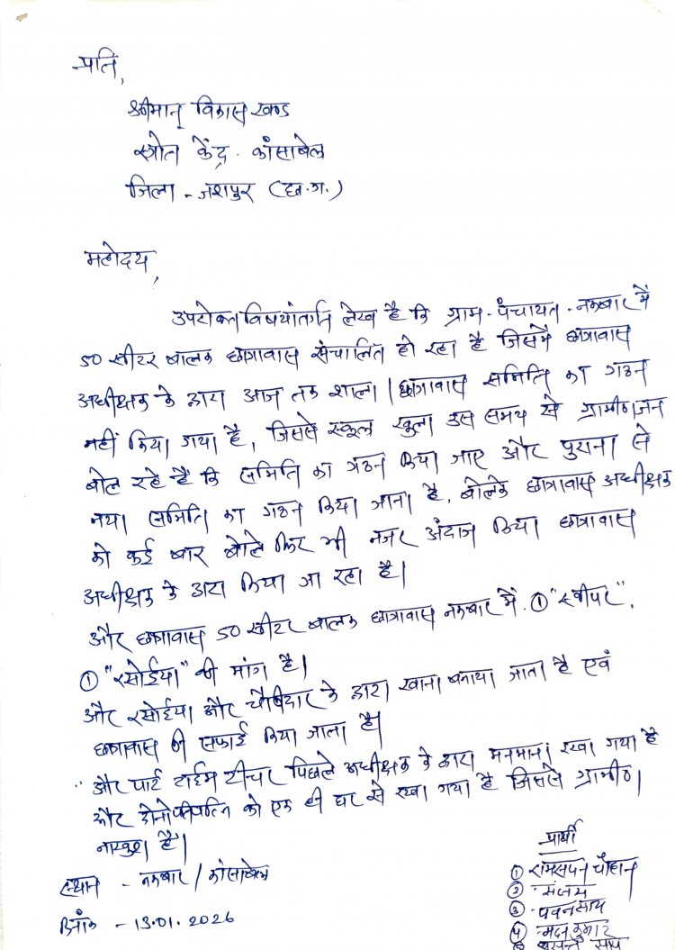 ग्रामीणों ने 13 जनवरी 2026 को विकासखंड स्रोत केंद्र में लिखित आवेदन देकर छात्रावास की गंभीर समस्याओं की ओर ध्यान आकर्षित किया था: