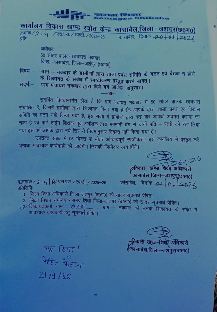 ग्रामीणों की शिकायत पर संज्ञान लेते हुए BEO कांसाबेल ने 20 जनवरी 2026 को अधीक्षक को कारण बताओ नोटिस जारी कर 5 दिनों में जवाब मांगा था। हालांकि, यह बात सामने आई है कि अधीक्षक द्वारा दिए गए स्पष्टीकरण में स्वीपर और रसोइया की मांग के महत्वपूर्ण बिंदु को कथित तौर पर छिपाया गया है, जबकि ग्रामीणों के आवेदन में यह प्रमुखता से दर्ज था।