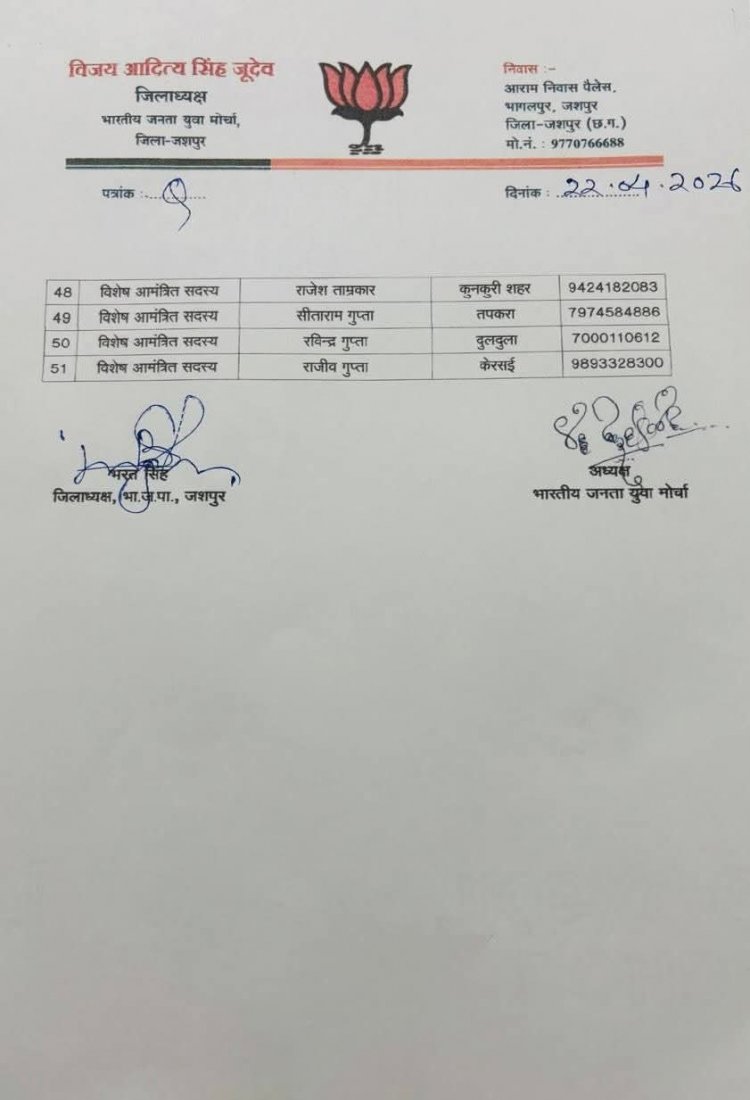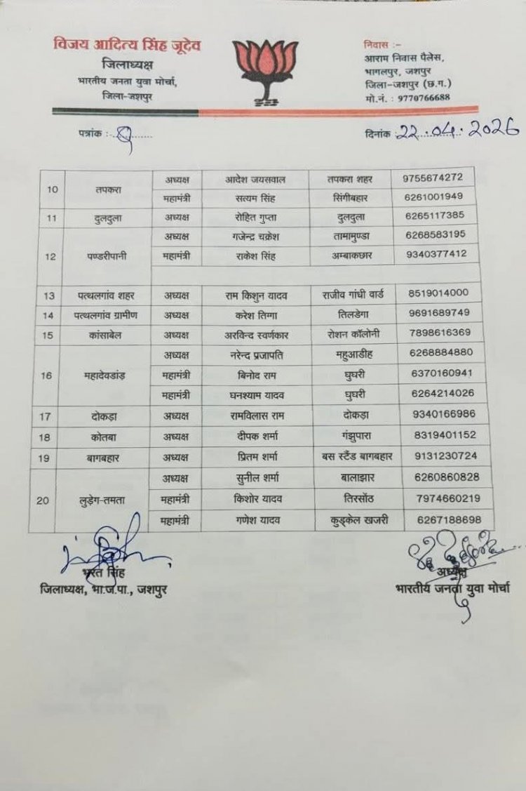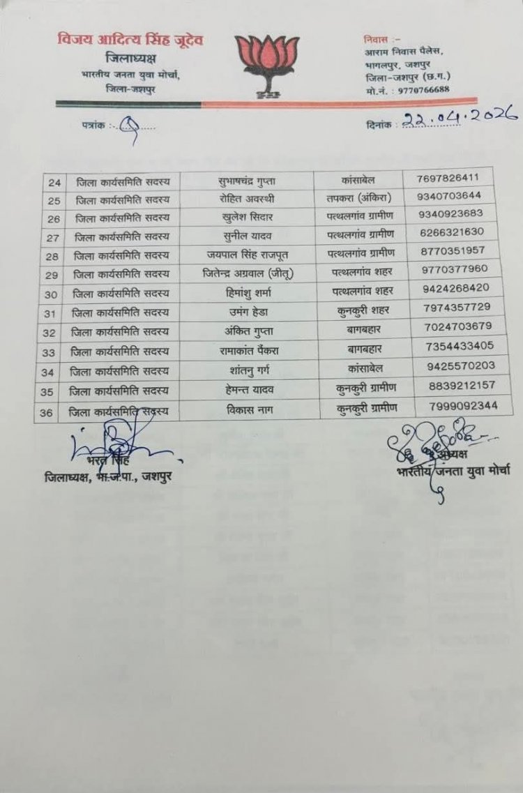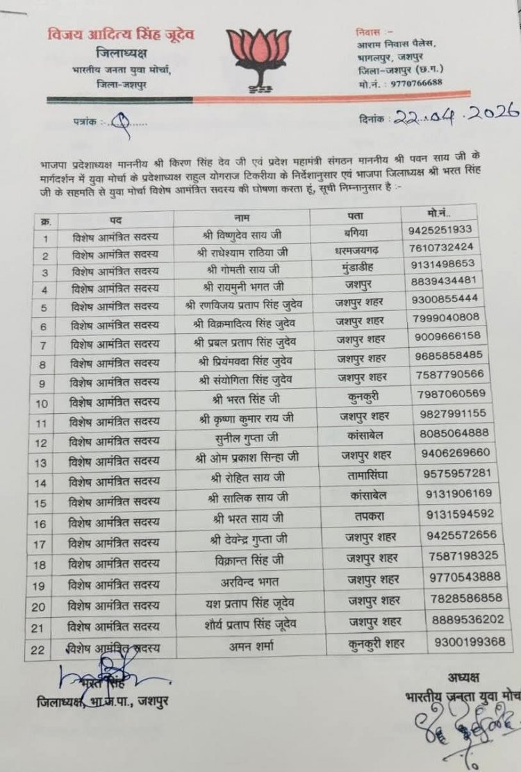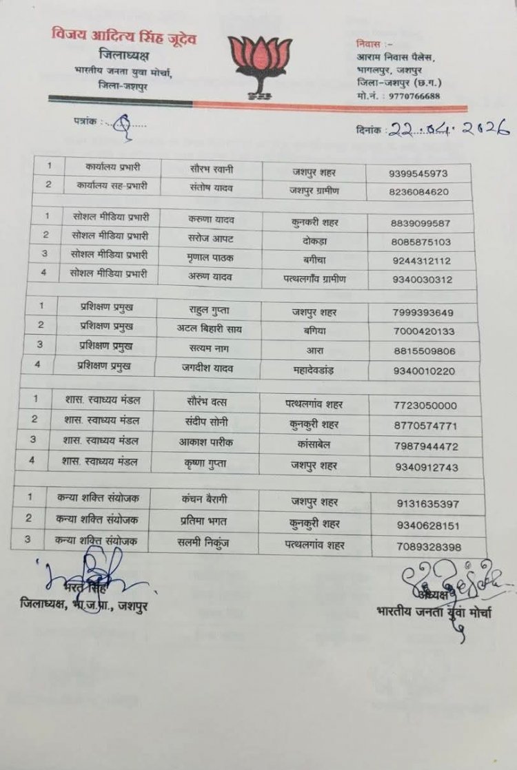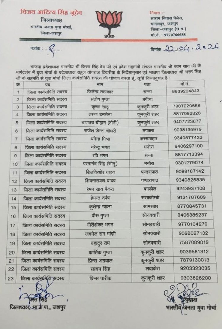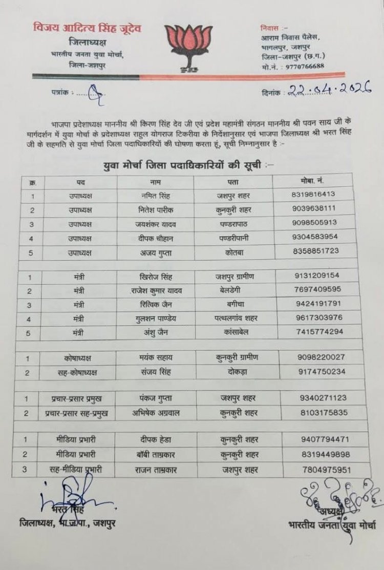 जशपुरनगर। भारतीय जनता युवा मोर्चा (BJYM) के सांगठनिक ढांचे को मजबूती प्रदान करते हुए जिला अध्यक्ष विजय आदित्य सिंह जूदेव ने अपनी नई टीम की आधिकारिक घोषणा कर दी है। भाजपा प्रदेश अध्यक्ष किरण सिंह देव और प्रदेश महामंत्री (संगठन) पवन साय के मार्गदर्शन में जारी इस सूची में अनुभवी और सक्रिय कार्यकर्ताओं के बीच संतुलन बनाने की कोशिश की गई है।