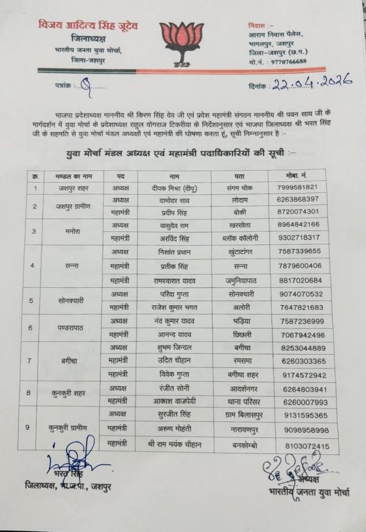 जशपुर: भारतीय जनता युवा मोर्चा की जिला कार्यकारिणी और मंडल अध्यक्षों की घोषणा, ऊर्जावान टीम को मिली जिम्मेदारी