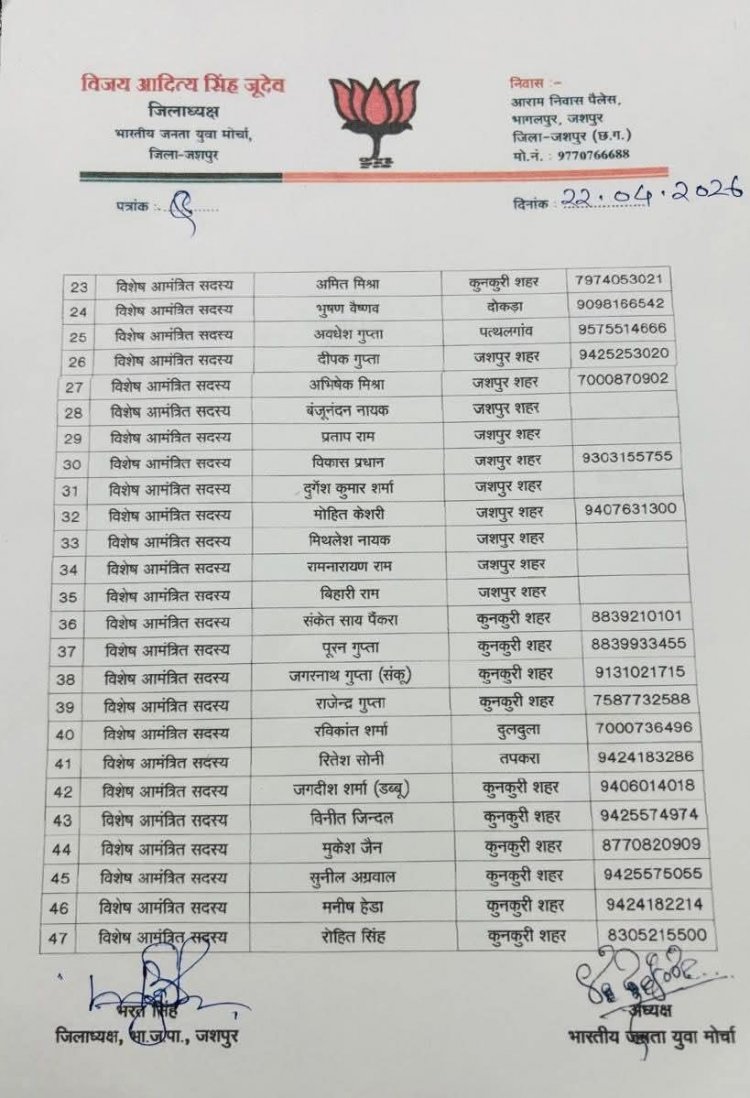 जारी सूची में कुल 36 जिला कार्यसमिति सदस्यों और 51 विशेष आमंत्रित सदस्यों को शामिल किया गया है। विशेष आमंत्रित सदस्यों की सूची में क्षेत्र के कई दिग्गज नाम जैसे मुख्यमंत्री विष्णुदेव साय, सांसद गोमती साय और रणविजय प्रताप सिंह जूदेव का नाम शामिल है, जो युवाओं को अनुभवी मार्गदर्शन प्रदान करेंगे।